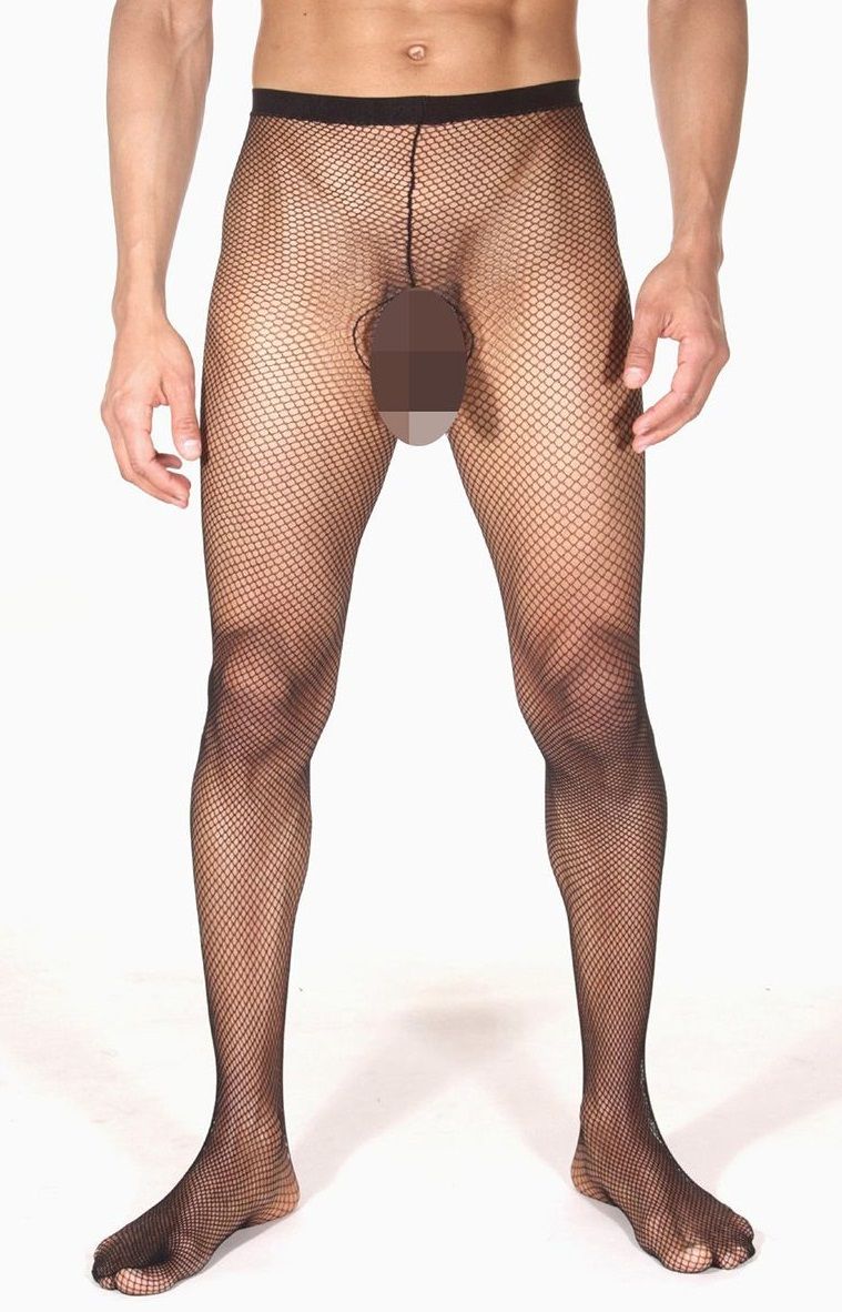 Мужские колготы черного цвета в мелкую сеточку. На колготках есть вырезы в интимной зоне и на ягодицах. Ткань, из которой изготовлены колготки, отлично тянется и не будет доставлять никакого дискомфорта.