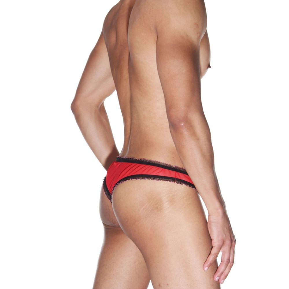 Бразилиана для мужчин из полупрозрачной красной ткани. Окантованы узкой маленькой черной рюшей, которая оторочена розовым цветом.