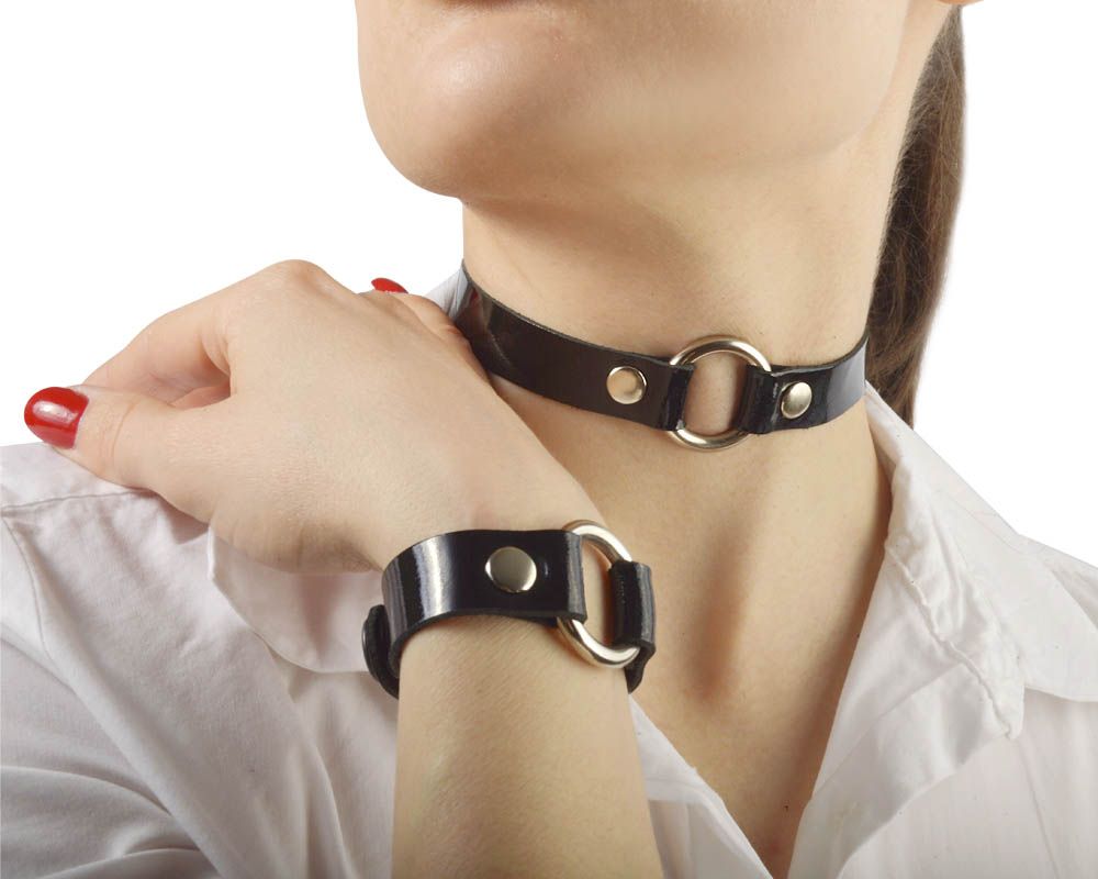 Чокер из натуральной лаковой кожи, украшен металлическим кольцом. Регулируется при помощи кнопок. Металлическое кольцо имеет никелевое покрытие. Ширина - 1,5 см.