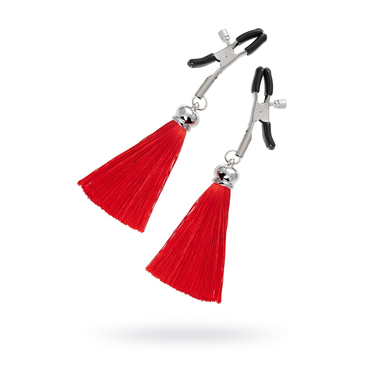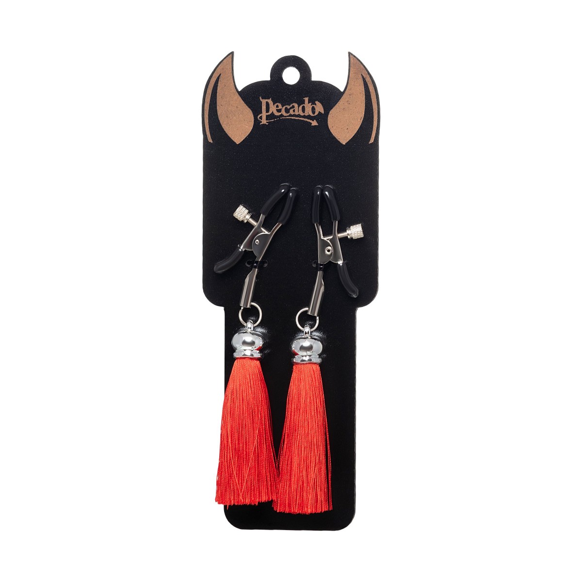 Хотите усилить ощущения от страстных игр с партнером? Увеличить степень возбуждения до невозможного можно с помощью зажимов-прищепок ручной работы от Рecado. Невероятно сексуальный аксессуар пробудит фантазию и повысит чувственность эротических зон. Мягкие резиновые накладки оберегают соски от повреждений. Металлический винт регулирует степень сжатия зажимов: от нежно-приятного до сильно-грубого. На концах черные резиновые наконечники, для безопасного воздействия на нежные участки тела. Компактный размер удобно вмещается как в женскую, так и в мужскую руку. Кисточки из натурального шелка не только визуально украшают эротический атрибут, но и еще утяжеляют его. Для самых смелых и искушенных любителей доминировать и подчиняться. Длина кисточки - 8,5 см.