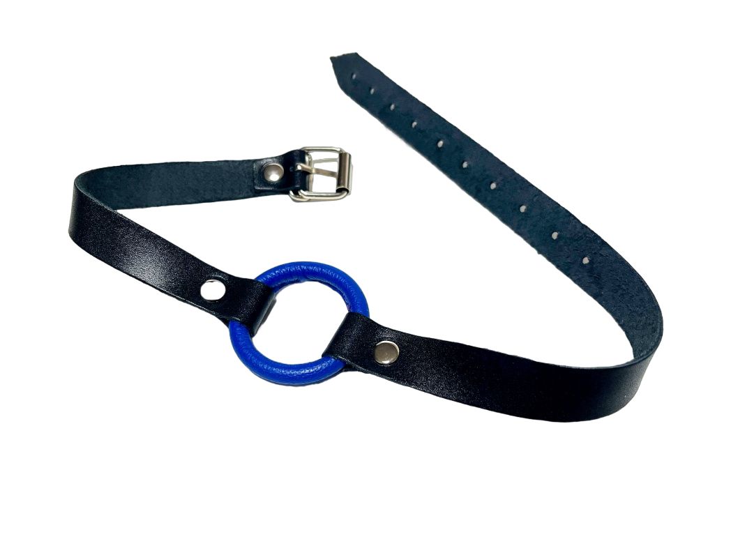 Строгий и надежный кляп, выполненный из натуральной кожи черного цвета. В основании использовано сварное металлическое кольцо, обтянутое нежной овечьей кожей синего цвета. Обхват удобно регулируется с помощью металлической пряжки. Такой кляп станет отличным элементом БДСМ игры, функциональным и комфортным в использовании. Диаметр кольца - 4,5 см. Ширина ремешков - 1,8 см.