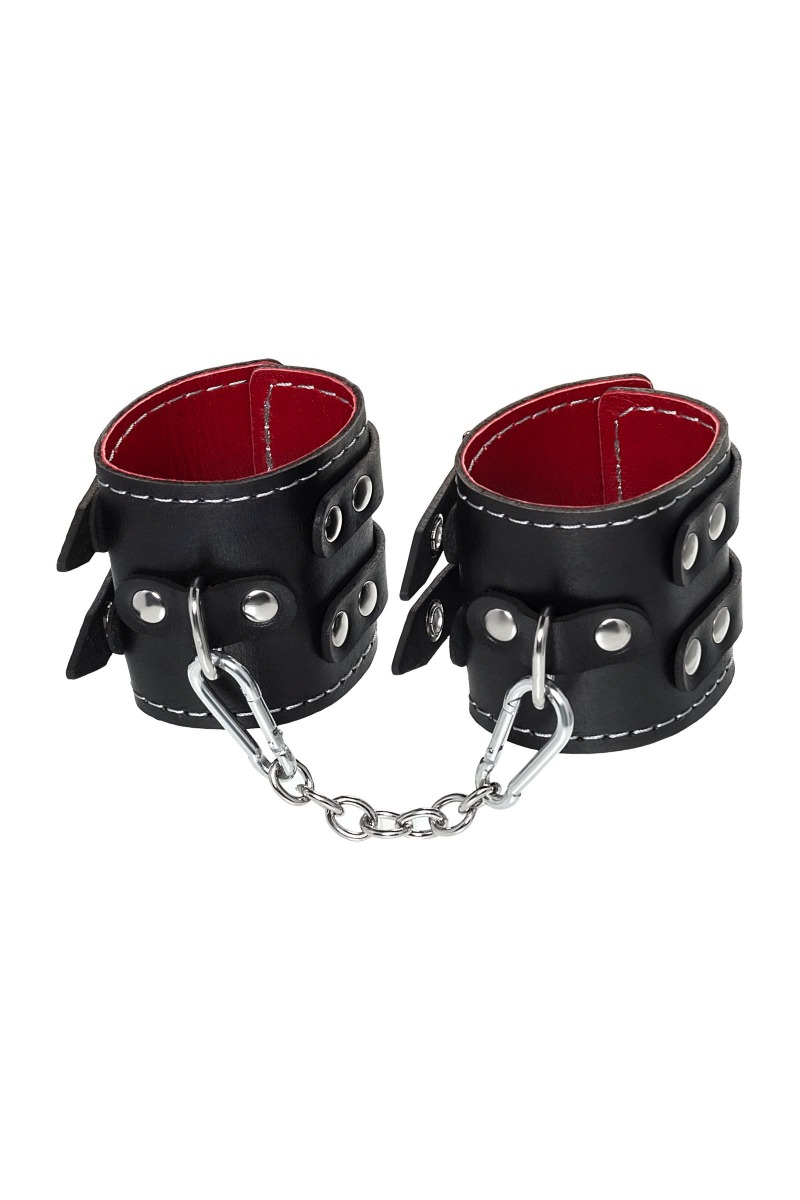 Эти кожаные наручники с двумя ремнями и красной подкладкой могут стать стильным аксессуаром, а могут послужить вашим целям по своему прямому назначению. Частичное обездвиживание и невозможность двигать руками дают вам полную власть над партнером – взрослые игры для взрослых. Наличие двух колец и карабинов, соединенных между собой металлической цепочкой, позволяет использовать изделие как раздельно – аксессуар-манжеты, так и как наручники для фиксации. К широким металлическим кольцам также можно присоединить и другие аксессуары при помощи карабинов. Благодаря универсальному размеру наручники могут использоваться и мужчинами, и женщинами. Размер легко регулируется с помощью металлических пряжек, органично вписывающихся в общий стиль. Длина манжет - 20 см, ширина - 7 см. Длина сцепки - 13 см.