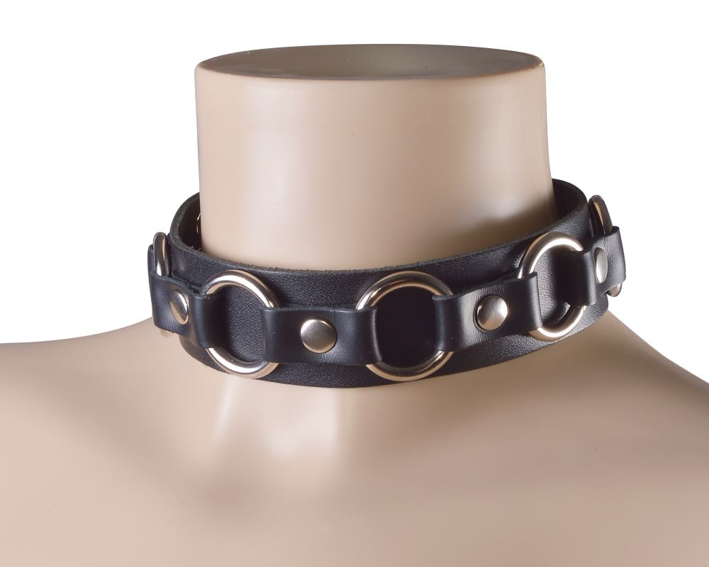 Ошейник изготовлен из натуральной кожи, декорирован шестью металлическими кольцам. Размер регулируется при помощи пряжки. Поводок кожаный.