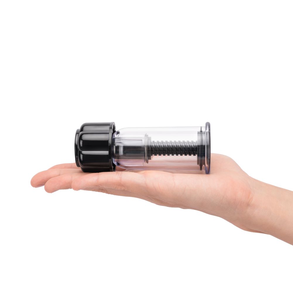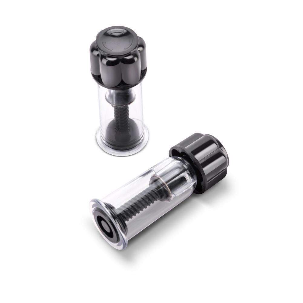 Пара вакуумных стимуляторов для сосков из пластика. Крупные, из черного и прозрачного прочного пластика. Вакуум создается путем выкручивания поршня за крупную черную головку стимулятора.