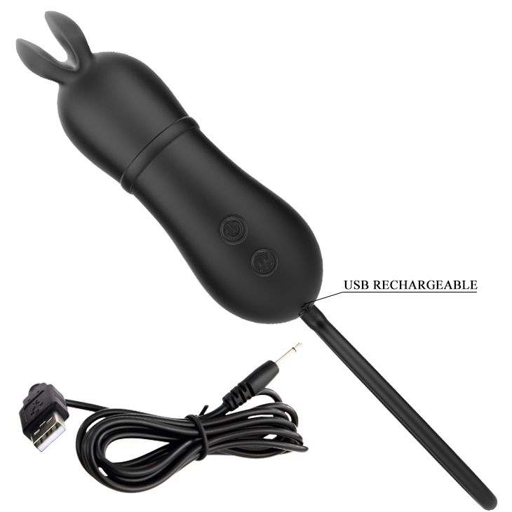 Черное виброяйцо Rosalie в виде зайчика. Выполнено из силикона. Имеет 7 режимов вибрации. В основании петелька для извлечения игрушки. Благодаря ушкам виброяичко отлично подходит для клиторальной стимуляции. Рабочая длина - 9 см.